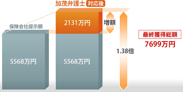 増額 加茂が代理人として入ることによって獲得できた賠償金額の増額分です。